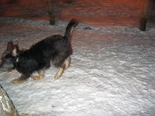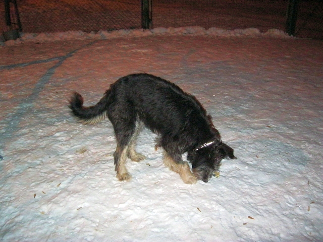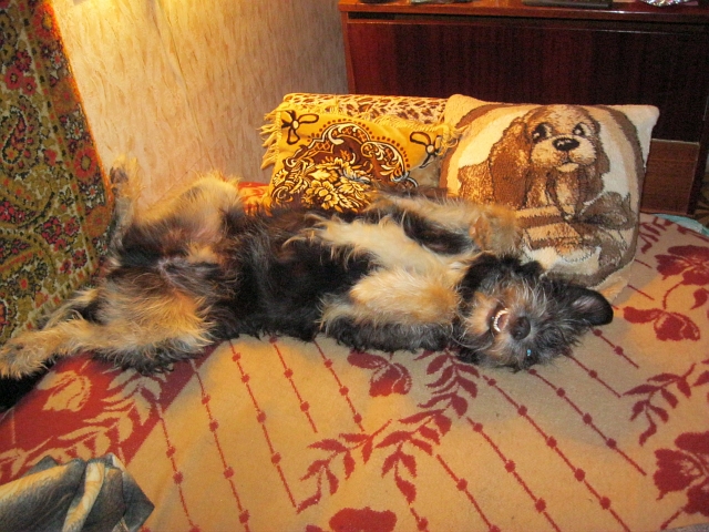 «Со мной и "бабушкой" у Терюши полный контакт, а "деда" всё ещё боится. Гуляет нормально, с удовольствием, только утром и вечером, когда людей на улице поменьше, а днём ему стрёмно. Выскочит, пописает и быстрей домой. Нашёл себе 2 подружек и приятеля - 7-месячного щенка таксы Батона, но, к сожалению, не всегда удаётся пересечься с ними на прогулке. Утром и вечером вожу его на 5-метровом поводке: ему носиться хочется, а я редко и ненадолго пока решаюсь его отпускать - очень страшно: вдруг не послушается и с ним что-нибудь случится. Со вчерашнего дня гоняю его в загоне - площадке для выгула, когда там никого нет. Нарезает круги с такой скоростью, что при попытке следить за ним начинает кружиться голова.
